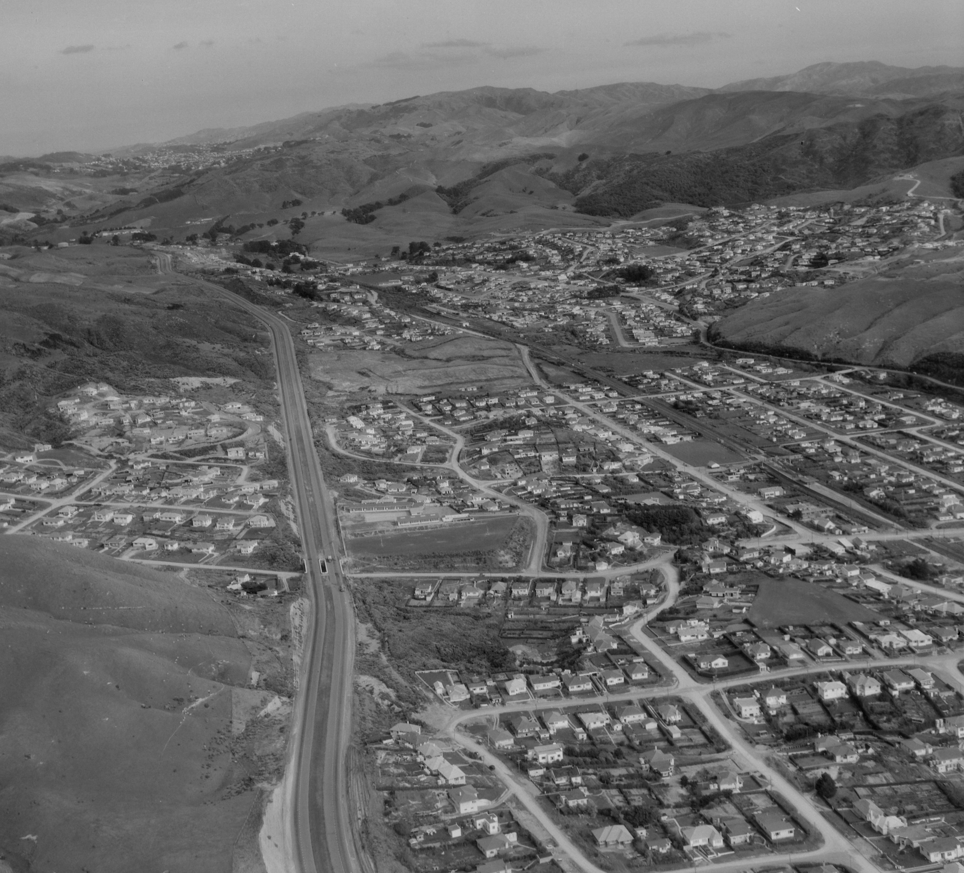 View over Tawa Flat with the Porirua-Johnsonville Motorway, Linden Primary School and the communities of Raroa Park, Linden, Tawa and Redwood, Wellington City. Whites Aviation Ltd: Photographs. Ref: WA-47281-F. Alexander Turnbull Library, Wellington, New Zealand. /records/30633703 & Google Earth Image 2021