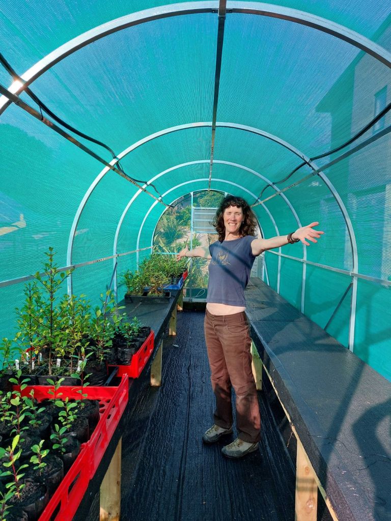 John and Andrew took 400 plants up to the top of Te Ngahere o Tawa for planting out in the next month, so that made room for some of the newly potted up ones, the rest went into our new shade house.