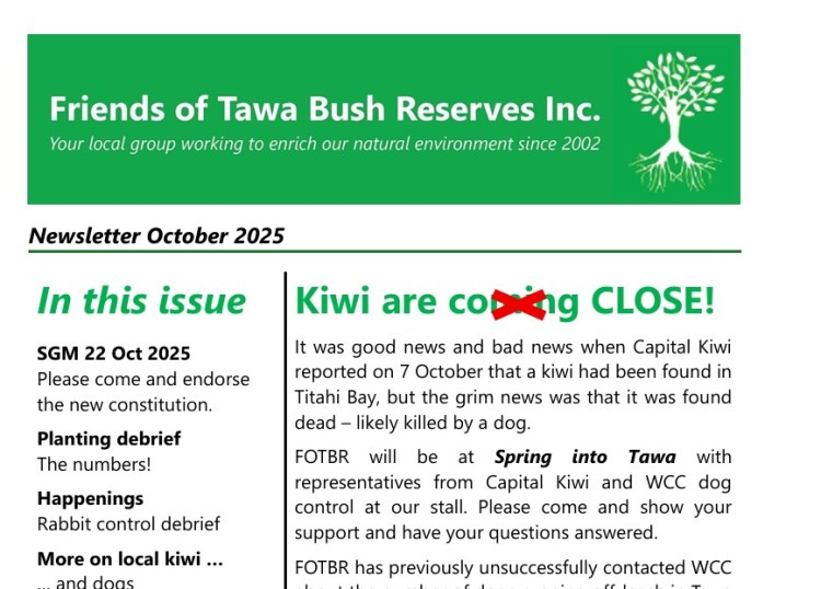 Newsletters are emailed periodically throughout the year to the Friends of Tawa Bush Reserves membership (and others interested) – keeping them up-to-date on all the goings on. If you wish to subscribe and have these informative newsletters sent directly to your inbox please sign up below.