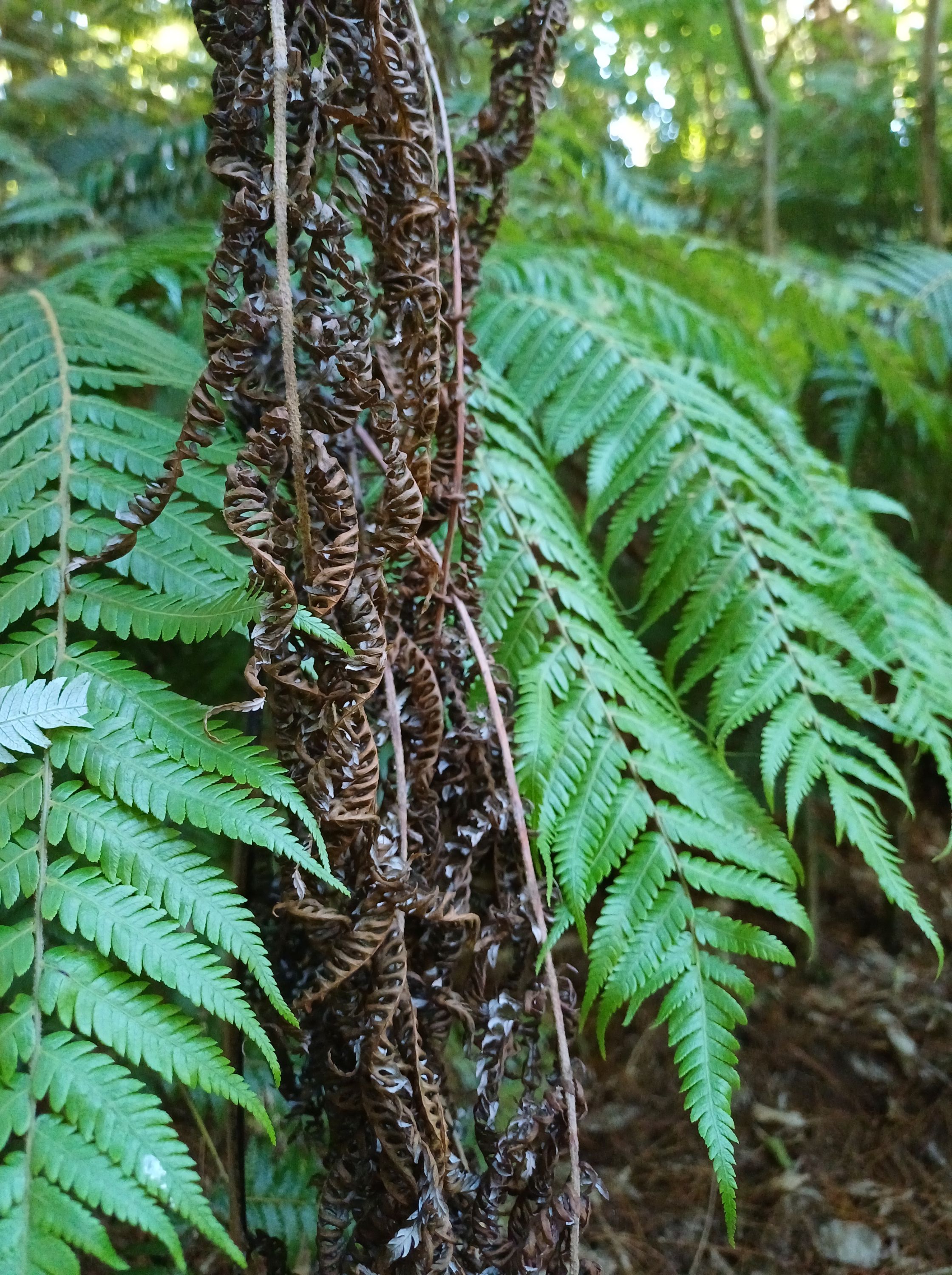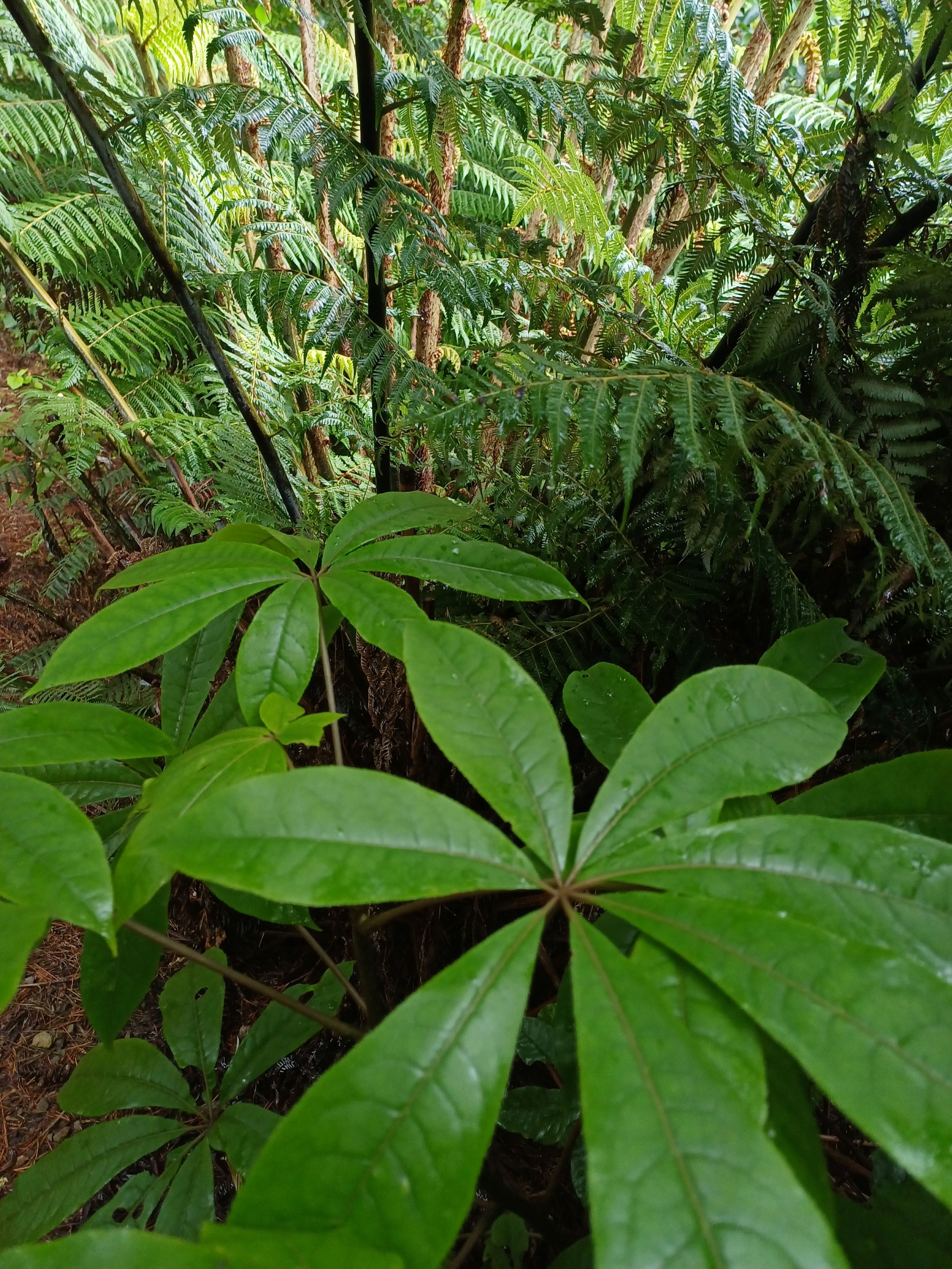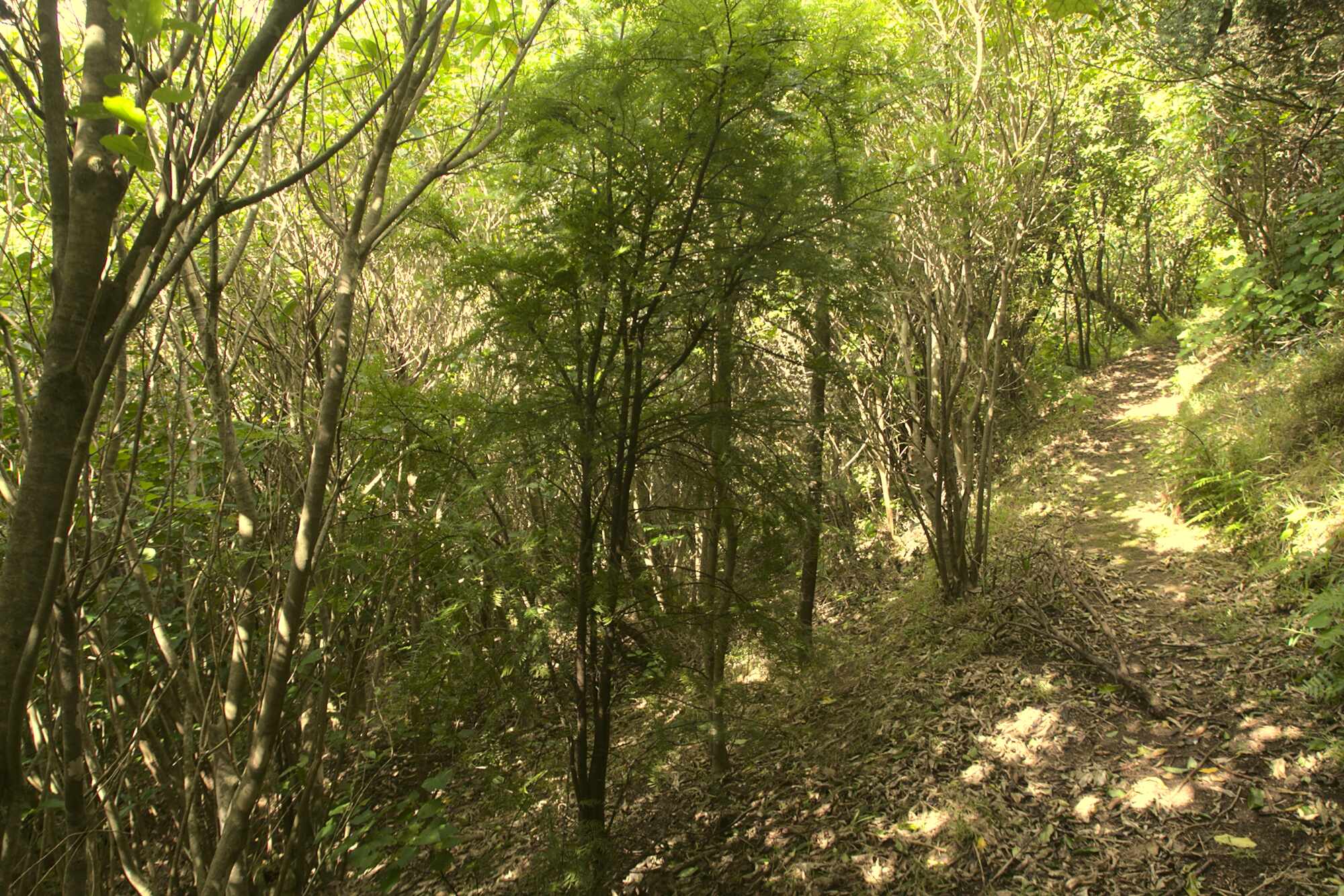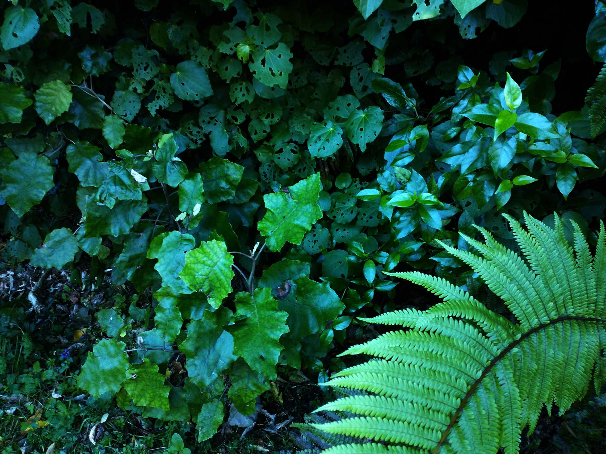 Apart from the obvious sections of pines – below which there is abundant regeneration of the original native trees, there are remnants of native forest, with tawa, kohekohe, rewarewa, and mahoe dominant. Below these, mapou, kawakawa, karamu, konano, hangehange, tarata (lemon wood), and five-finger are common, as well as regenerating tree and ground ferns.