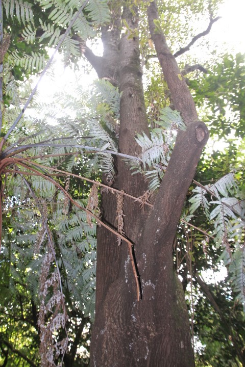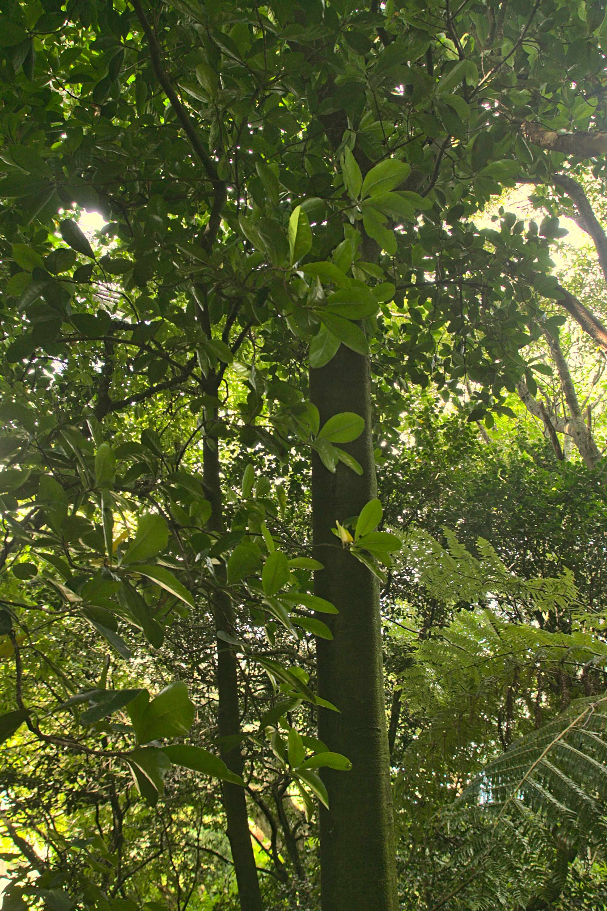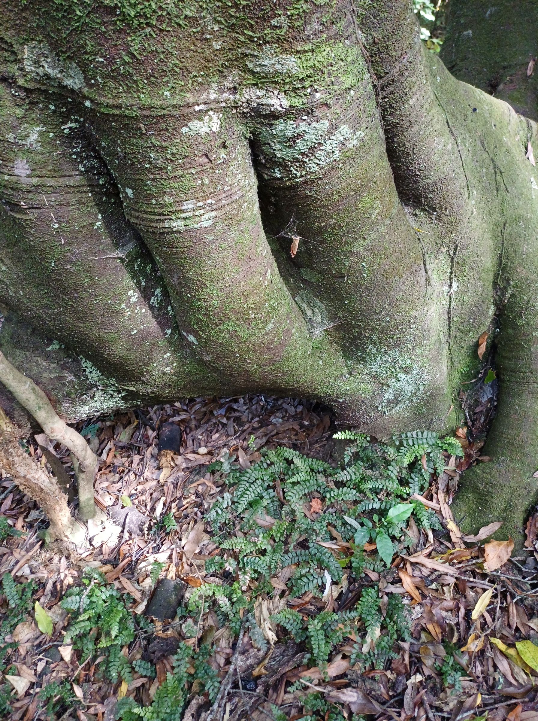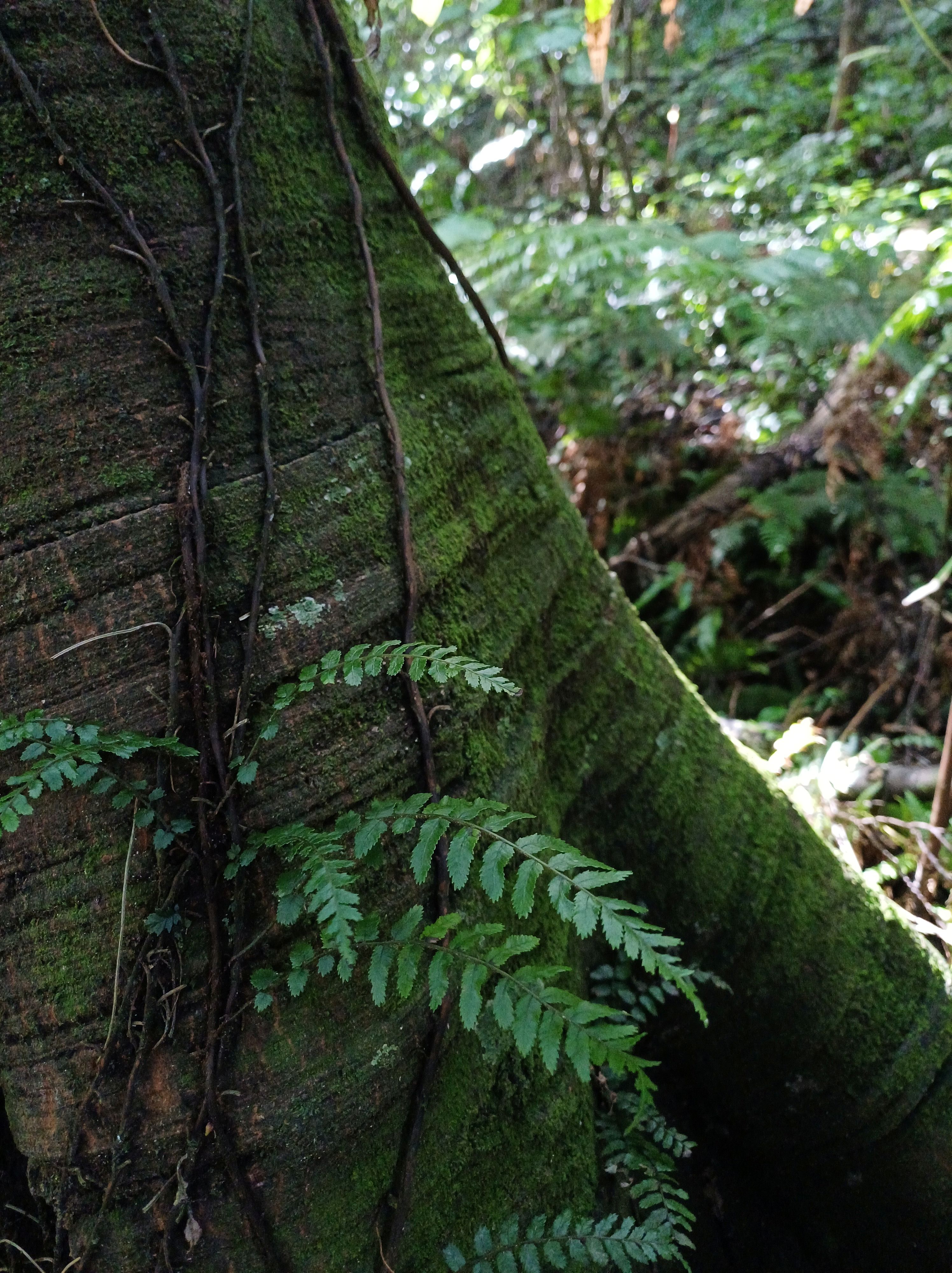 The regenerating bush near Brasenose Place is younger than that near the Achilles Close and Peterhouse streets. Overall, the canopy trees near Brasenose Place entrance are at a lower level with mahoe common, while tarata, puka, fivefinger, rangiora, kanono, and akeake are present at lower levels. Also, young podocarps such as rimu, totara, and kahikatea have been planted. This contrasts to the other two entrances where mature tawa and kohekohe are dominant on entry to the bush. On the path between Achilles and Peterhouse there are many thriving clumps of filmy ferns but also some huge pukatea that show their large buttress roots. The huge tawa in the gully are reputed to be the biggest in Tawa.