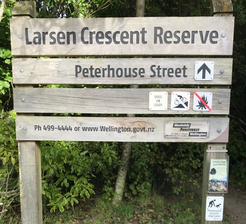 Larsen Crescent and hence the name Larsen Crescent Reserve, commemorates the Larsen brothers whose family was of Scandinavian extraction. Larsen Crescent was developed in the 1950s and 1960s by Peter Hibma in partnership with the trustees of the estate of Frederick W. Larsen, farmer and landowner of the southern third of Section 41. The reserve is significant because of the huge mataī trees that were preserved due to local Tawa residents who ensured their retention at a time of expanding housing development in this location. The Wellington City Council bought the land containing the current reserve in 2001 following a public outcry on the proposed felling and housing of the whole area by a developer.