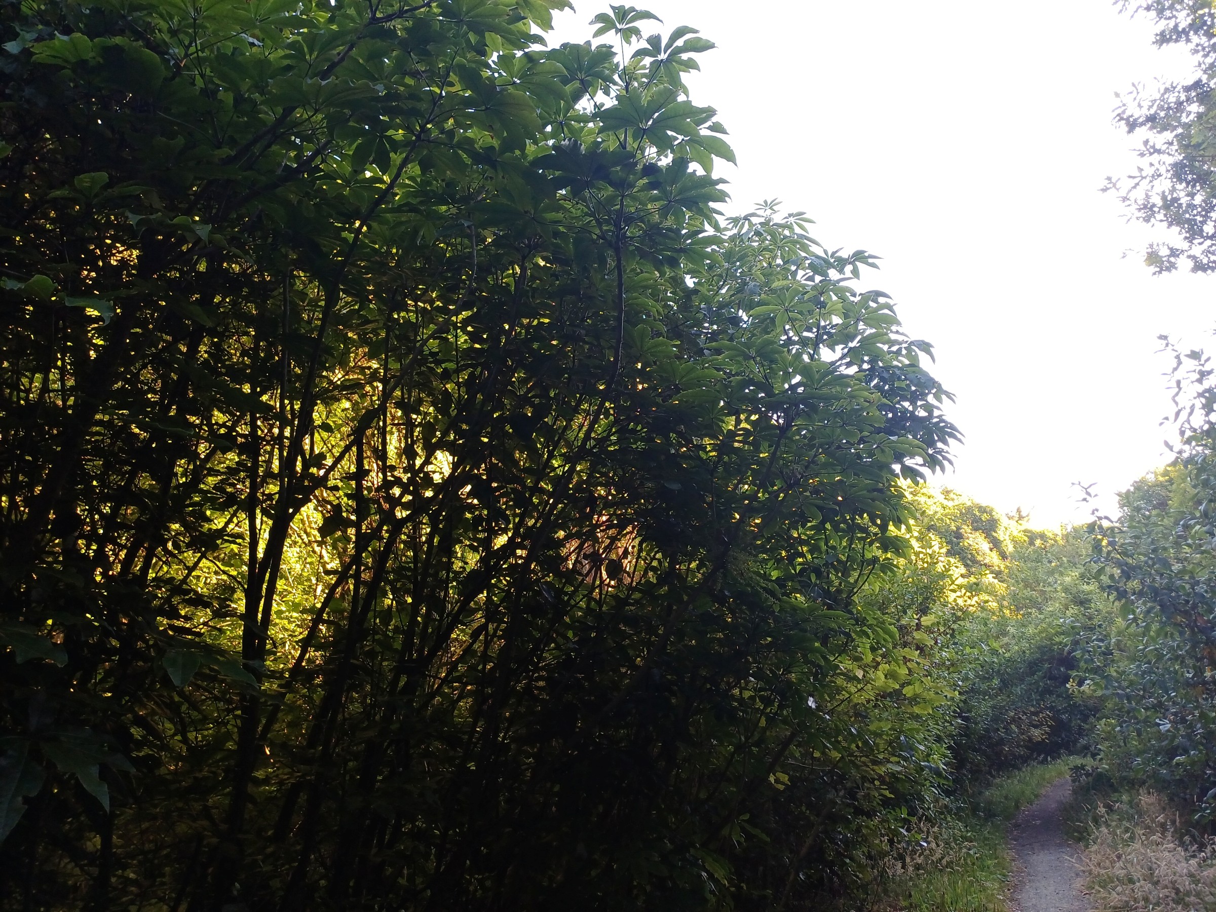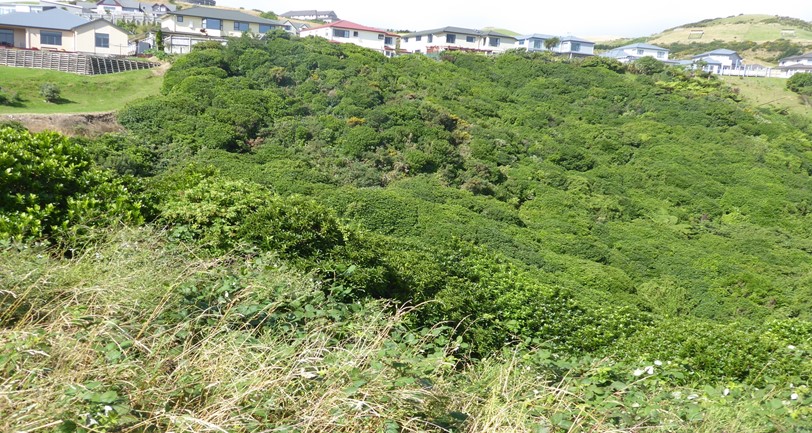 At the edge of the tall, grassed area, blackberry and gorse give way to dense secondary growth bush, dominated by 2 to 3 metre-high māhoe trees. The vegetation is dense and the slope steep, so no tracks have been developed, apart from giving access to bait stations for pest control by FOTBR. There is a dense cover of low-growing ferns at ground levels.