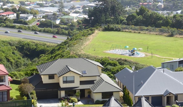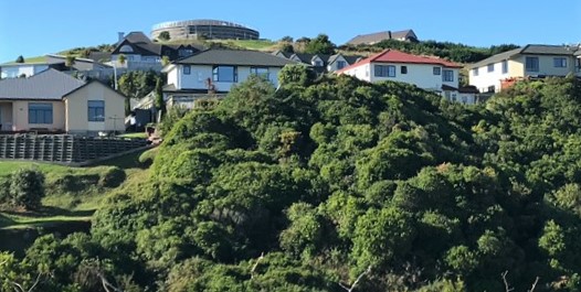 To the east, there are views of housing in part of Woodman Drive and Mervyn Kemp Drive. The low growing bush is visible in front of the housing. To the west, housing in parts of the southern area of Tawa can be seen, beyond the SH1 motorway.