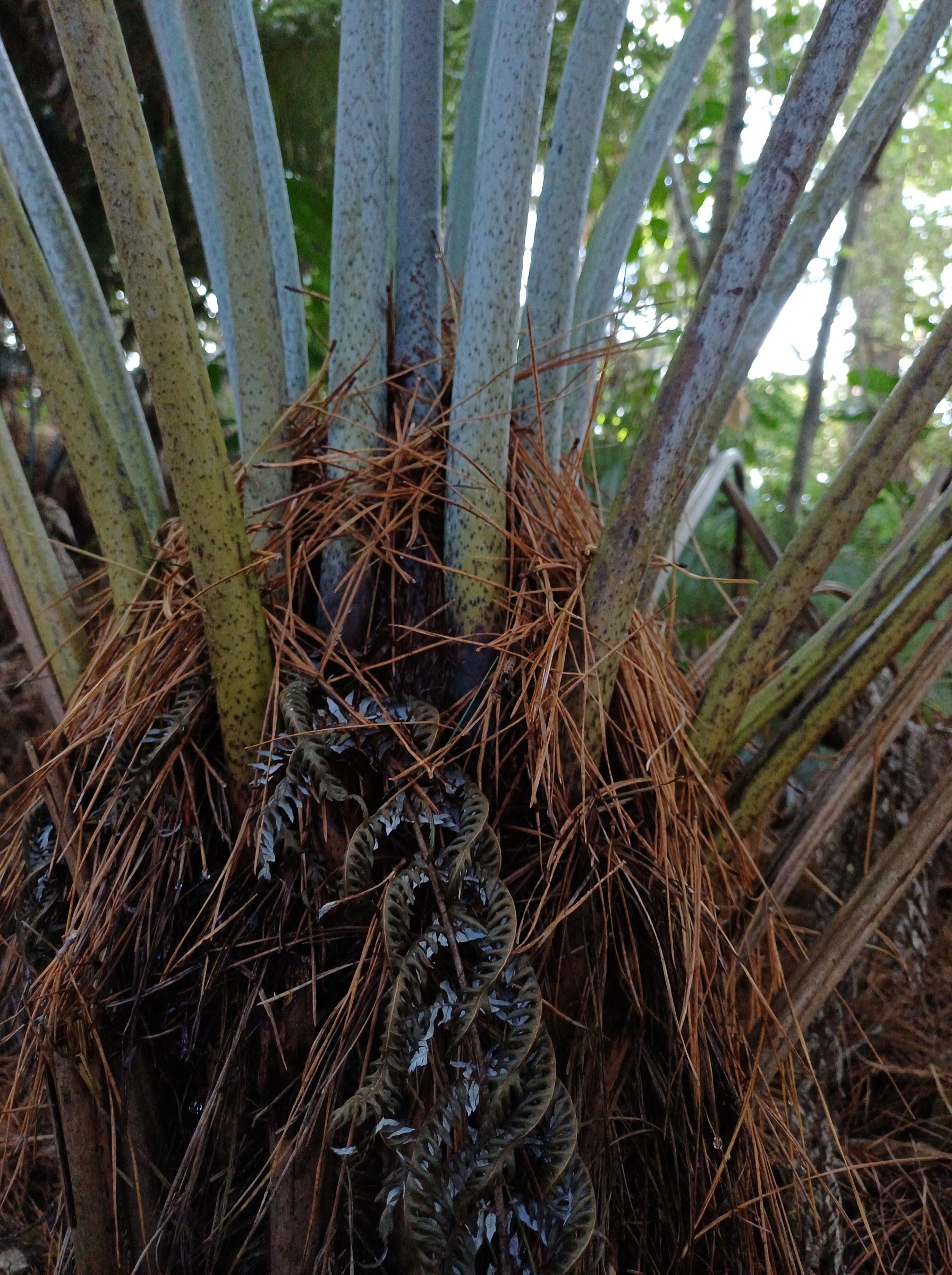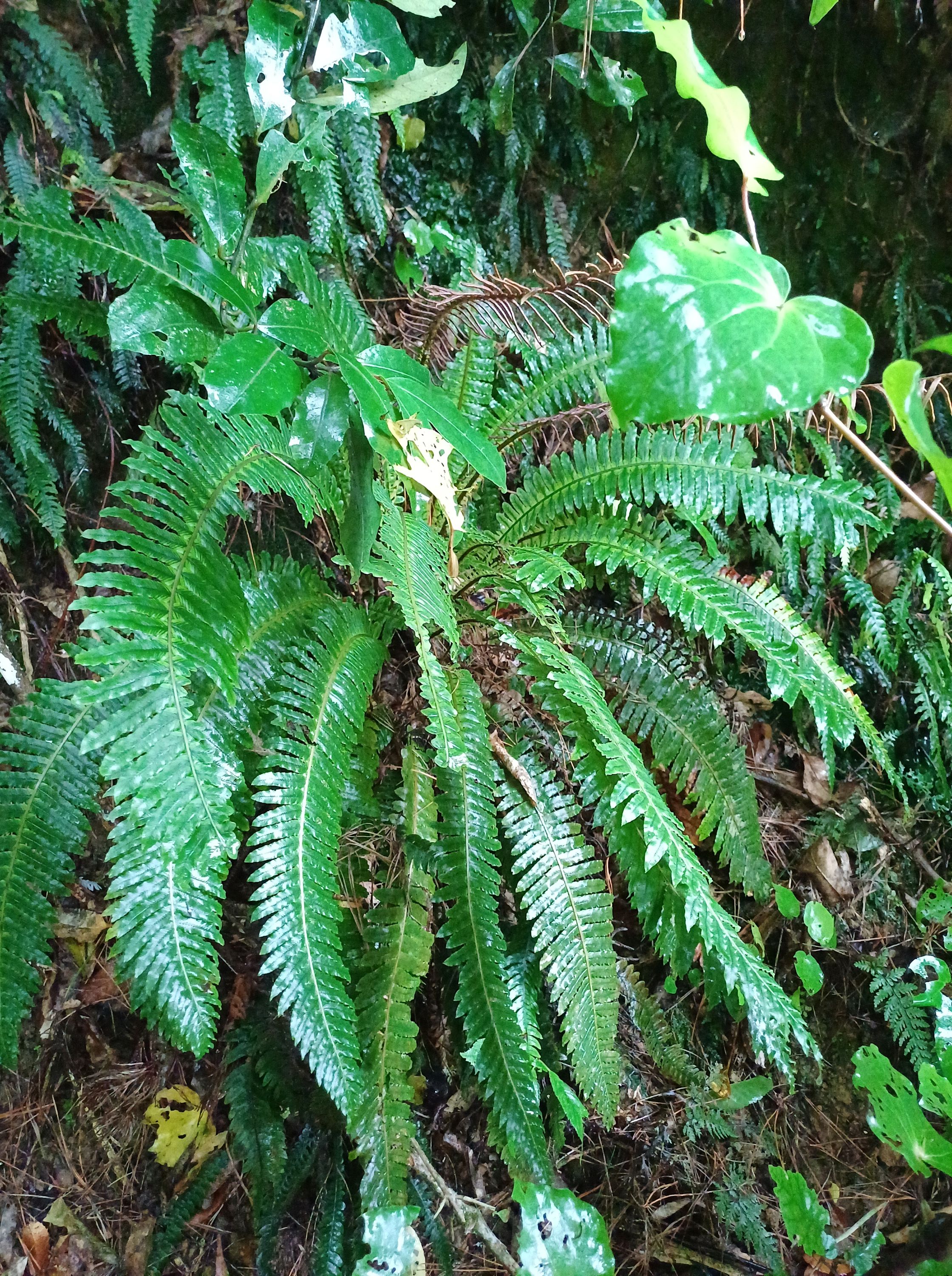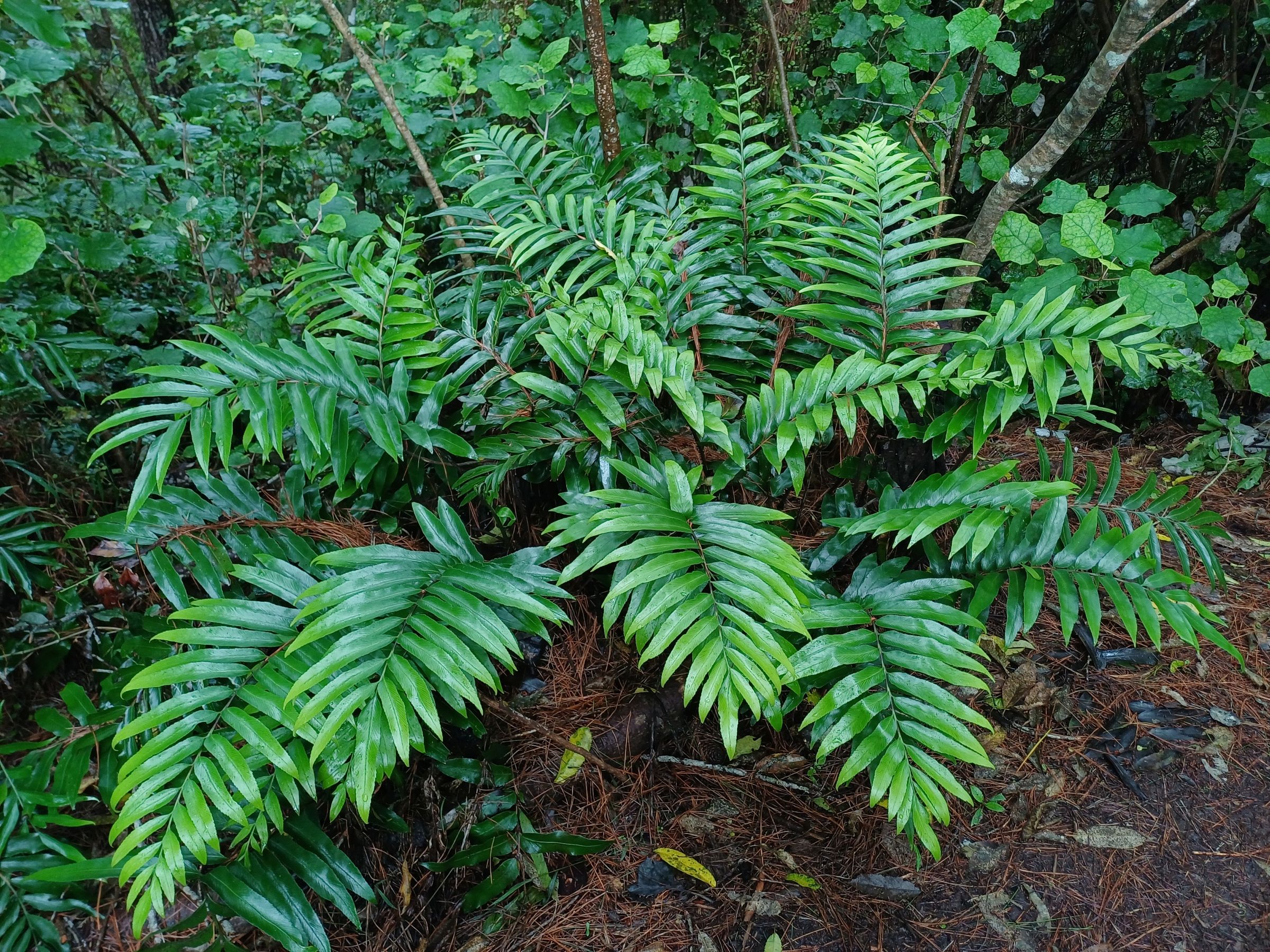 The dominant trees are the mature mataī, with large tawa, kohekohe and tōtara and some pukatea also in the canopy layers. In the shrub layers, karamū, kanono, kawakawa, and hangehange are the predominant trees. At the perimeter of the reserve, whauwhaupaku (five finger), makomako (wineberry), kaikōmako and tarata (lemonwood) are the most common. A karaka tree that was originally planted at the rear of Larsen Crescent has resulted in the establishment of seedlings, although this is not a naturally growing tree for this area. There is prolific regeneration of kohekohe and an expansive ground cover of Blechnum filiforme (pānako or thread fern).